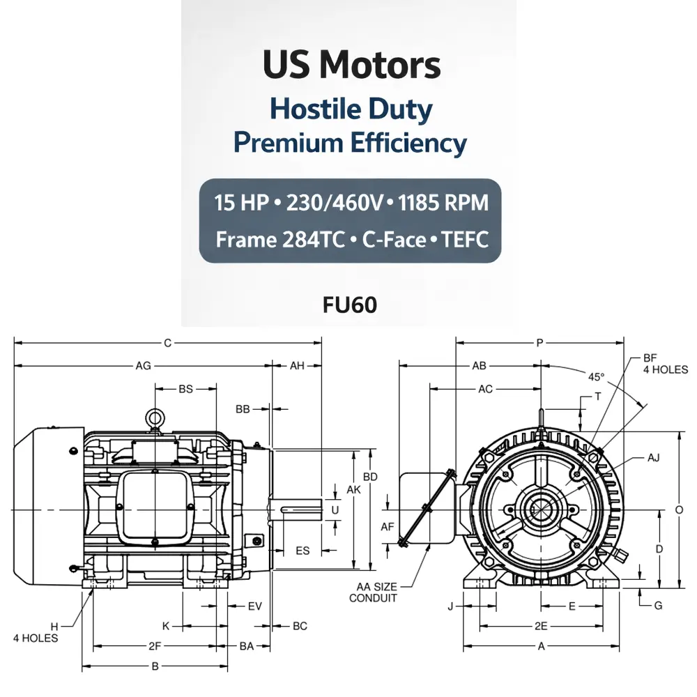 US MOTORS Hostile Duty Premium Efficiency (TEFC) C-Face para integración con brida (C-Face). En MCB lo suministramos y validamos compatibilidad de montaje, voltaje y protecciones para una instalación sin retrabajos.