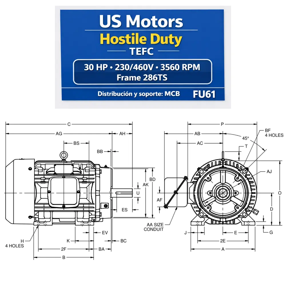 Motor US MOTORS Hostile Duty Premium Efficiency (TEFC) C-Face para integración industrial. En MCB lo suministramos y validamos compatibilidad de montaje (C-Face), voltaje y protecciones.