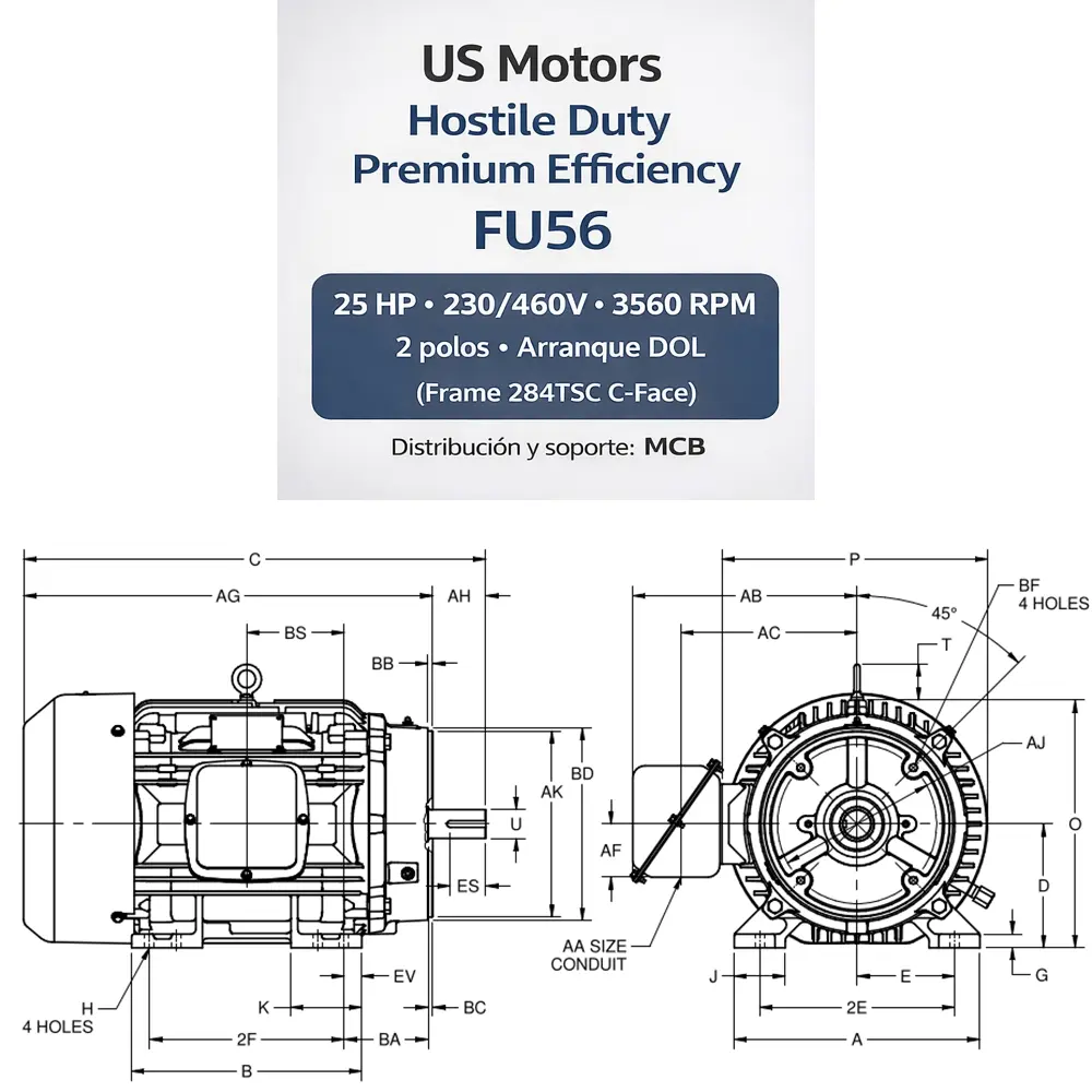 US MOTORS Hostile Duty Premium Efficiency (TEFC) C-Face para integración con reductores/ensambles. En MCB validamos compatibilidad mecánica (C-Face), voltaje y protecciones para una instalación sin retrabajos.