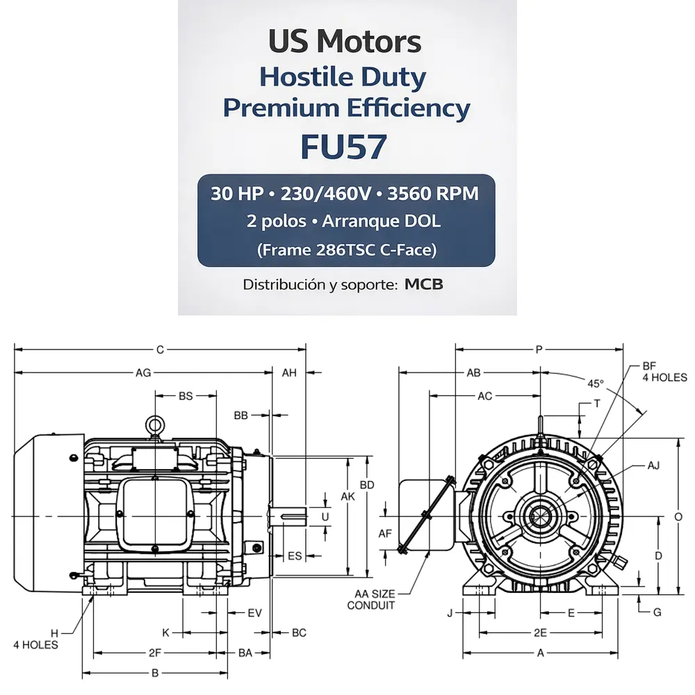 US MOTORS Hostile Duty Premium Efficiency (TEFC) C-Face para ensambles industriales. En MCB validamos el montaje C-Face, voltaje y protecciones para asegurar compatibilidad y operación confiable.