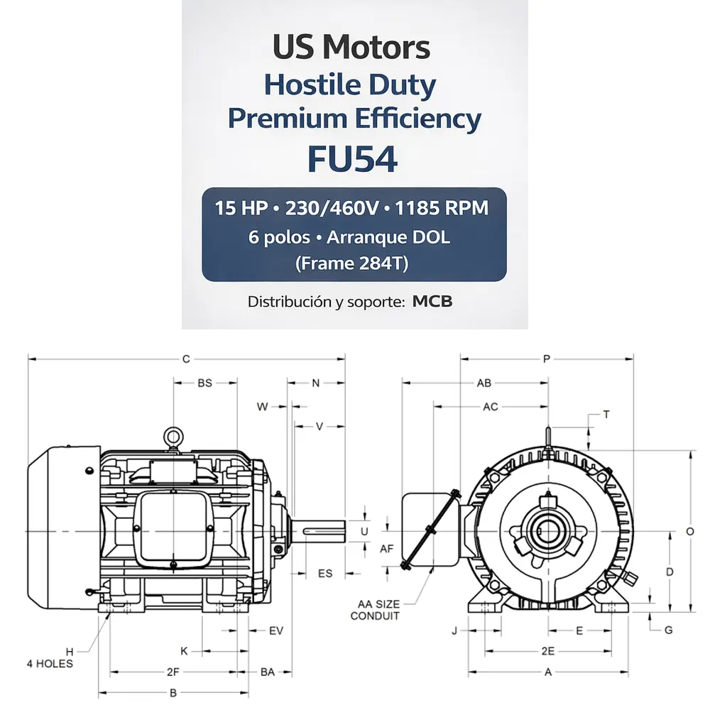 US MOTORS Hostile Duty Premium Efficiency (TEFC) ideal para operación industrial continua. En MCB te ayudamos a especificarlo (voltaje, protecciones y montaje) para que funcione a la primera.