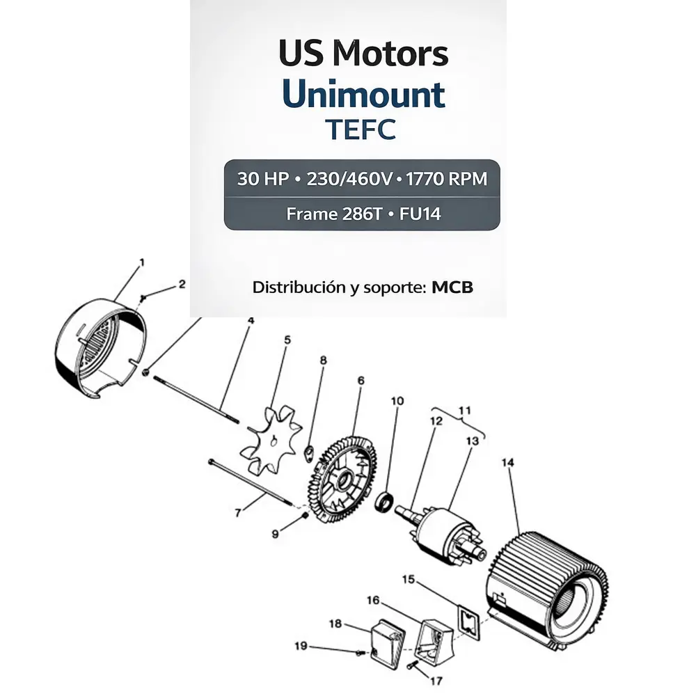 US MOTORS Unimount (motor-end) TEFC para gearmotor, diseñado para servicio continuo industrial. En MCB lo suministramos y lo especificamos para que tu reemplazo sea compatible y confiable.